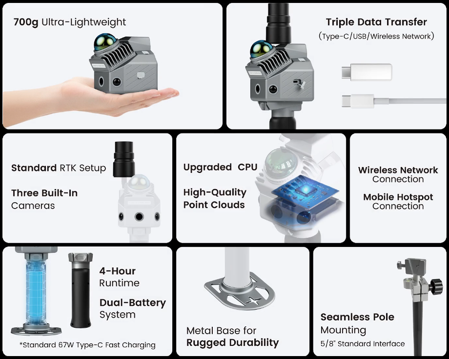 Weighing just 700g, the FJD Trion P2 LiDAR Scanner delivers centimeter-level precision, real-time colorized point clouds, and multi-format outputs. Its field-ready design lets professionals capture complex landscapes and intricate details with ease.